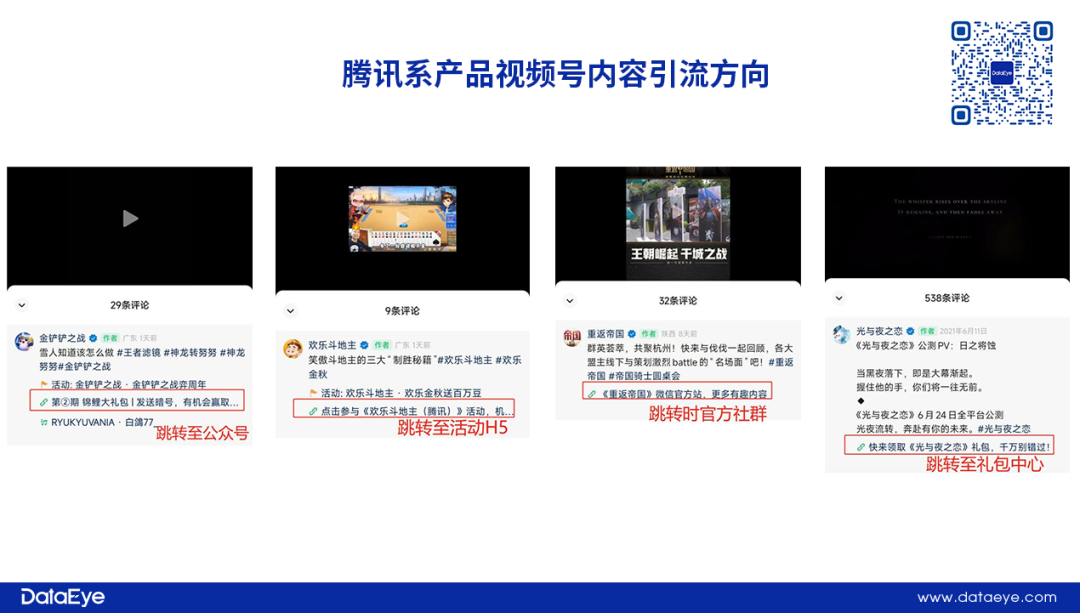 其二,引流至游戏内容详情页。基于微信生态,项目组可以在视频号内容让玩家直接进行跳转至相关内容详情页。例如《欢乐斗地主》跳转至H5活动页面,《金铲铲之战》进入微信公众号,《光与夜之恋》《重返帝国》《王者荣耀》等产品跳转至具体的详情里,例如礼包福利中心、游戏官方社区甚至商城页面等等。
