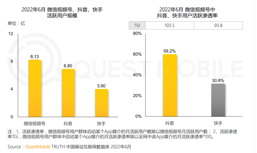 其二,日活跃用户领先抖音快手。根据《2022中国移动互联网半年大报告》,截至2022年6月,微信视频号月活跃用户8.13亿,超过抖音的6.8亿和快手的3.9亿,而且视频号对抖音的用户活跃渗透率接近60%。