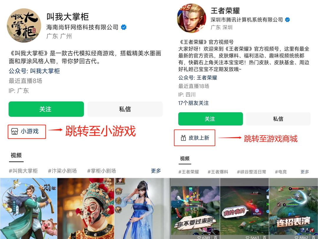 因此在游戏营销方面。厂商可以通过视频号直接触达更多用户。例如《叫我大掌柜》在主页上设置了小游戏入口,玩家点击后直接进入小游戏。另外,腾讯系多款游戏支持营销内容跳转,如新皮肤上架页面,玩家可以直接进入到指定页面进行购买。