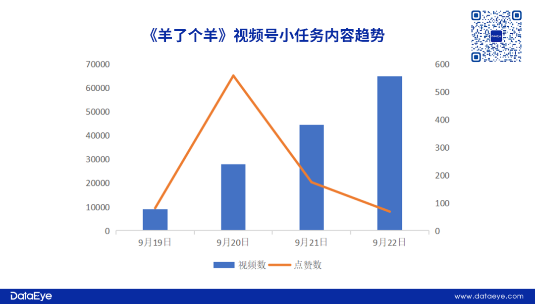 《羊了个羊》在产品爆发当天加码了视频号小任务发行计划,截至目前有超过1200名达人创作者参与,取到1700万播放量。百准数据显示,19号以来《羊了个羊》视频号小任务投稿数量不断提升,可是点赞数方面在20号达到峰值后,却持续下滑。(特别鸣谢:百准数据,一家微信视频号数字营销及产业服务平台)。