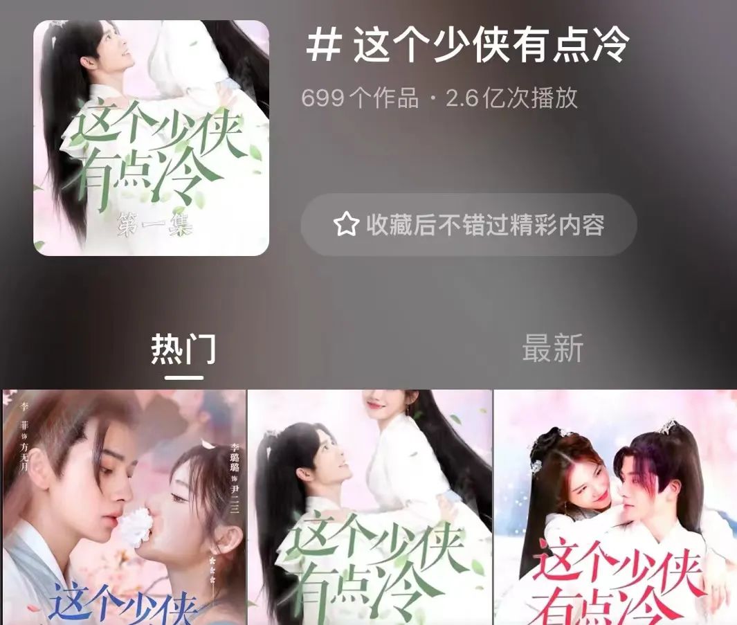 短剧形式内容不仅变现架构简单,而且内容可拓展性强,往往能提高用户的黏性和分享欲望,品牌影响力也随之提升。目前已经有不少成功的案例,例如《一梦江湖》衍生的古装短剧《这个少侠有点冷》,其话题内容在快手平台累计播放量高达2.6亿。