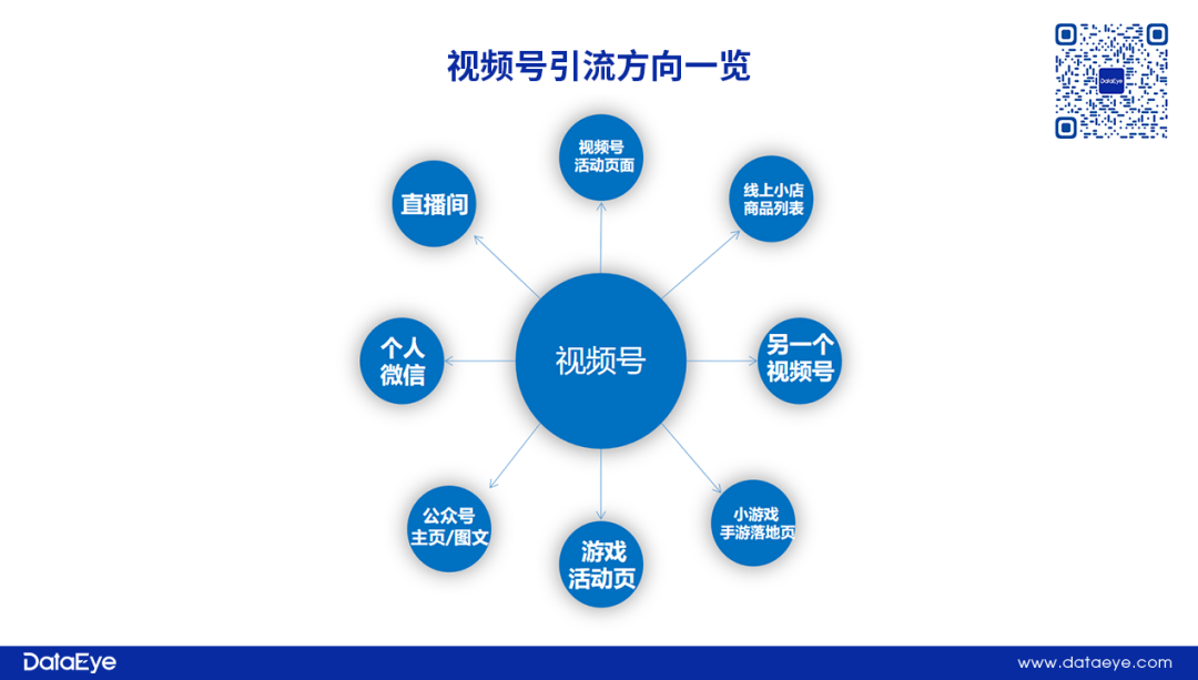 根据DataEye研究院发现,商家/厂商/个人博主让视频号成为一个流量入口,通过相关链接跳转到指定页面/产品/内容上。而且公众号/公众号图文、个人微信、游戏中心、落地页、直播间、其它视频号等,视频号都实现直接跳转。DataEye研究院不完全统计之下,引流方向高达8个。