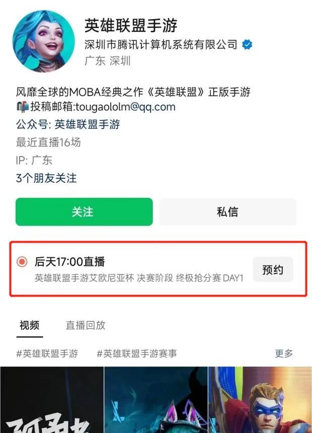 其一,推动赛事/游戏直播活动。例如英雄联盟手游视频号主页加入了相关赛事的直播链接,玩家可以直接预约或跳转。