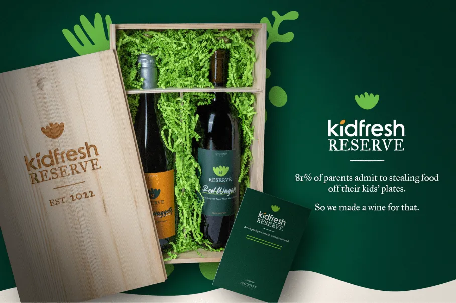 除了针对父母开展另类营销活动,Kidfresh近期还专门开发了一款葡萄酒Kidfresh Reserve,搭配儿童冷冻餐一起售卖。你也许会感到奇怪,为什么儿童健康餐要与葡萄酒一起搭配呢?