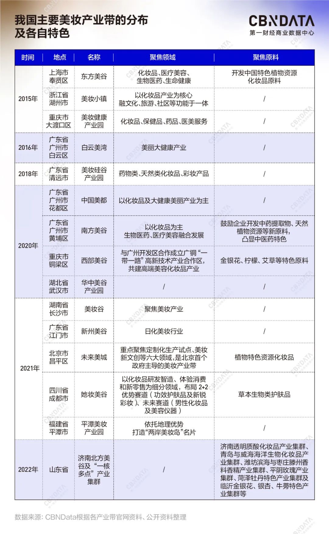 2014年,工信部正式启动产业集群区域品牌建设工作后,上海、浙江、广东率先规划美妆产业带,上海东方美谷、湖州美妆小镇、广州白云美湾经过几年发展初具规模,是目前发展较好的产业带代表。