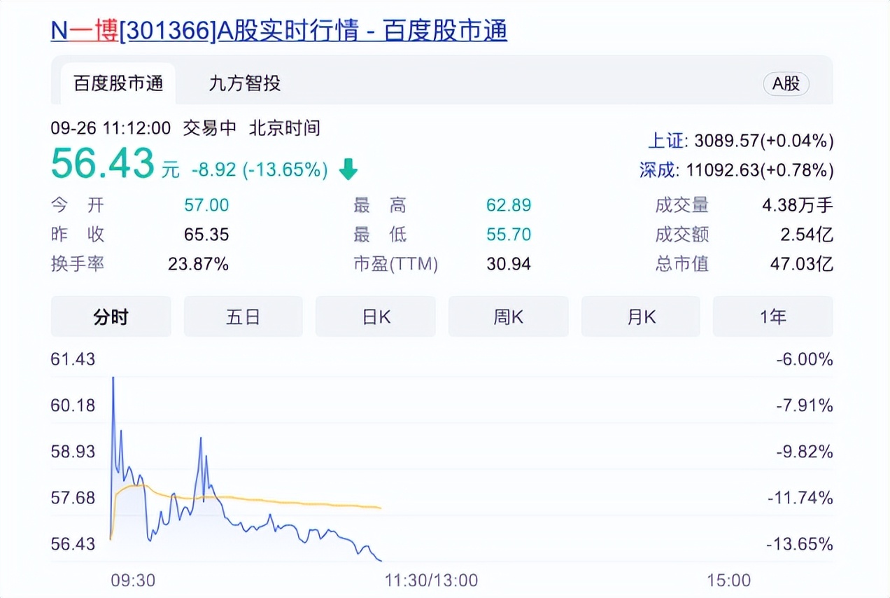 9月26日,一博科技在创业板上市,发行价格确定为65.35元/股,开盘破发,跌12.8%至57元/股;截至发稿前每股56.43元,对应公司总市值为47.03亿元。