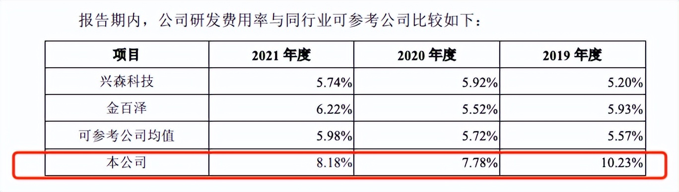 报告期内,公司的研发费用率分别为10.23%、7.78%、8.18%,高于可参考公司的均值5.57%、5.72%、5.98%。