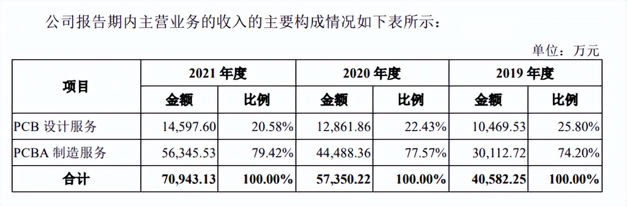 报告期内,其PCB设计服务收入占主营业务收入比重分别为25.80%、22.43%、20.58%,收入占比并不高,并呈逐年下降趋势,其营收来源主要依靠PCBA制造服务业务,报告期内占主营业务的比例分别为74.20%、77.57%、79.42%。