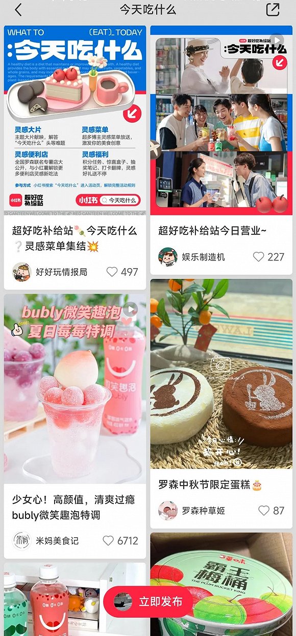 最近两次的“超好吃补给站”活动,小红书分别以“人生五味便利店”、“今天吃什么”两个主题,切入年轻人与便利店关系。小红书在站内发起的互动话题,吸引了众多用户产生丰富的UGC内容,还有用户自发地将“今天吃什么”的活动物料进行二次创作,并且在微博和抖音平台形成了大规模的二次传播。