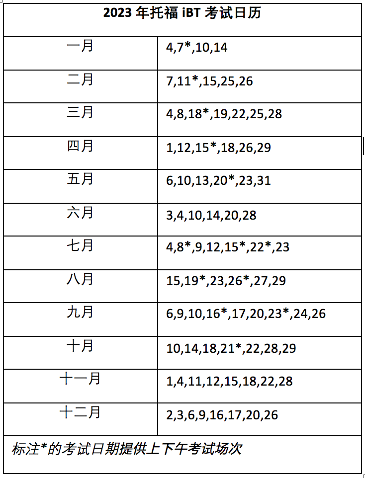 2023年共开放79个考试日期的92场托福iBT考试,和34个考试日期的GRE普通考试。其中托福iBT考试的考试日期为历年最多,较2022年增加了13个考试日期。此外,托福考试还首次增开了周二考试日期,每周共有四个考试日期。2023年全年考试日期安排如下: