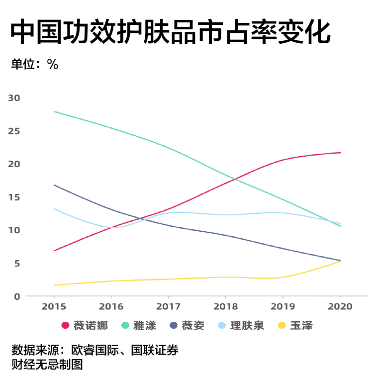 与此同时,同赛道的竞争对手也对“薇诺娜”的霸主地位虎视眈眈。早年,凭借主打“舒敏”概念,差异化的“云南药妆”定位,借势线下药店渠道与线上电商渠道,薇诺娜在中国功效性护肤品的市占率从2015年的6.8%上升至2020年的21.6%。