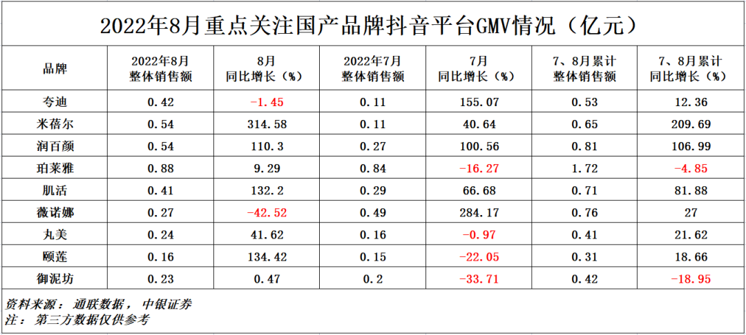 据红塔证券最新跟踪数据,8月“淘抖”大盘下,珀莱雅淘系销售额与抖音销售额均领先贝泰妮。在抖音,华熙生物“润百颜”与鲁商发展“颐莲”销售额收入增速实现三位数增长,而“薇诺娜”不升反降,销售额同比下降42.52%。