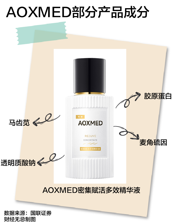但贝泰妮所谓的“云南香格里拉高原珍稀成分”的故事依旧是新瓶装旧酒。据国盛证券研究所的分析,从目前AOXMED发布的相关产品来看,马齿苋、透明质酸、胶原、麦角硫因等当下流行的热成分均被涵盖在内。