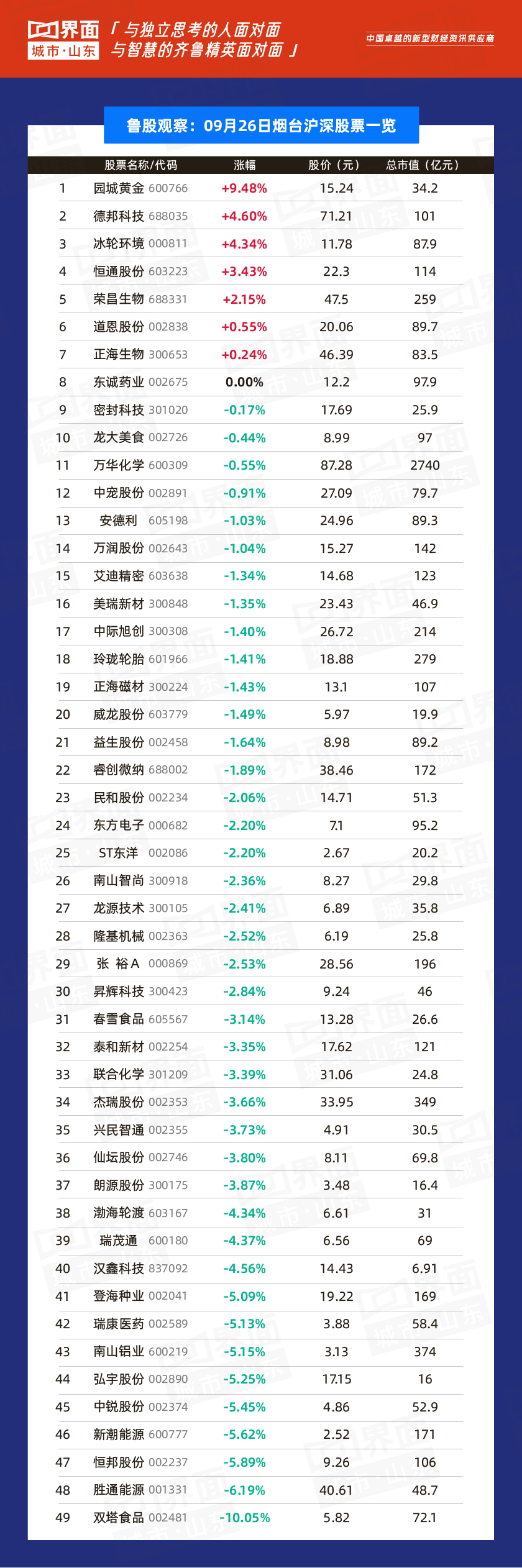 烟台市涨幅榜首:园城黄金(600766),涨幅:9.48%,股价15.24元,总市值 34.2亿元;
