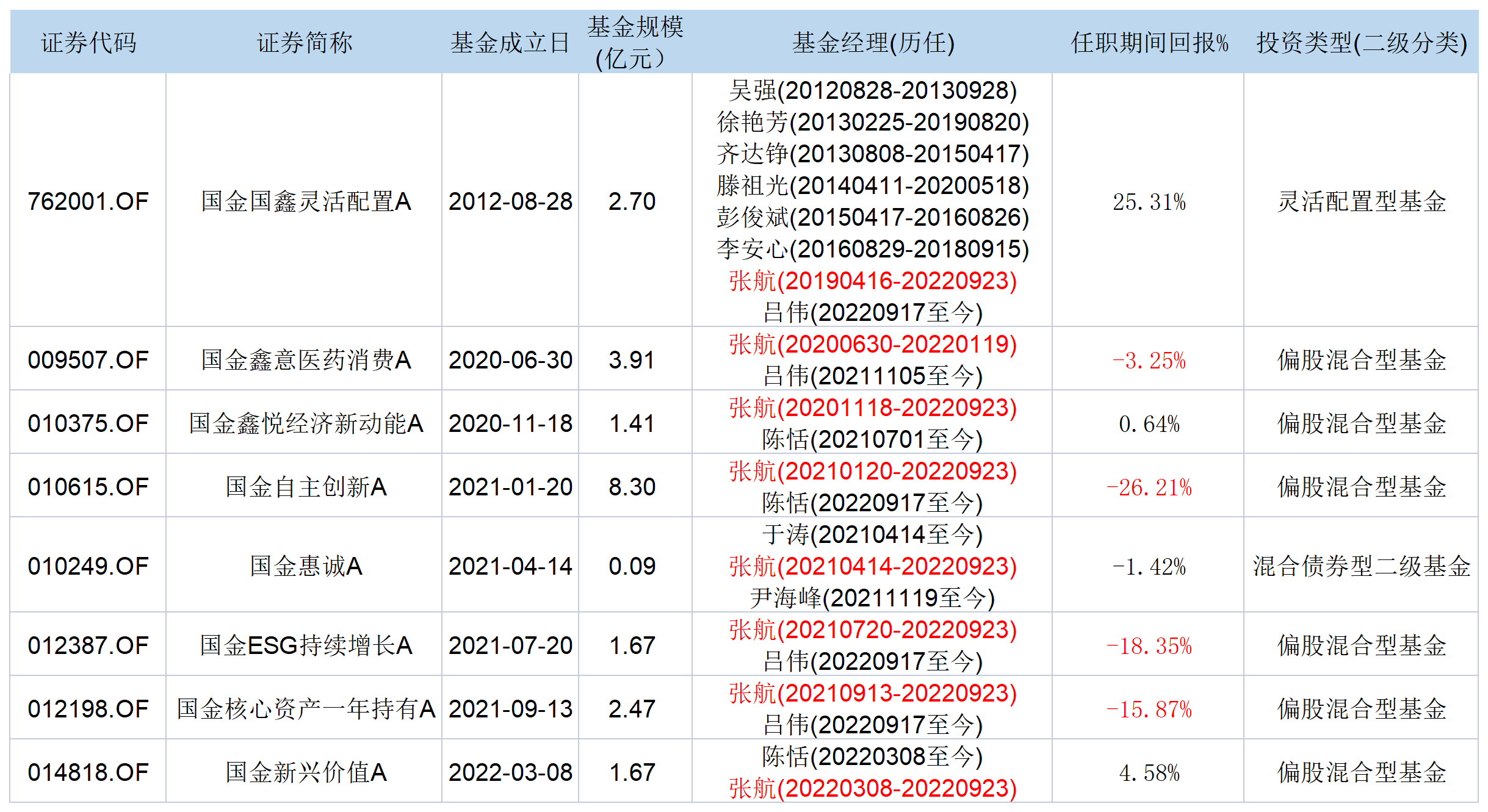从任职期间业绩来看,国金国鑫灵活配置在张航任职期间(2019年4月16日-2022年9月23日)回报率为25.31%,国金鑫悦经济新能源在任职期间(2020年11月18日至200年9月23日)回报率为0.64%, 国金新兴价值在任职期间(2022年3月8日至9月23日)回报率为4.58%,其余5只基金的任职回报率均为负数。