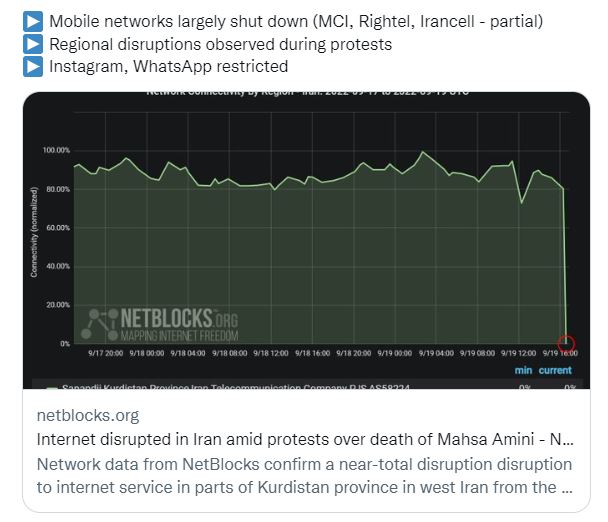 与此同时,社交媒体平台Instagram和WhatsApp无法访问;上周一到周五,伊朗西部库尔德斯坦省的互联网几乎全部中断。