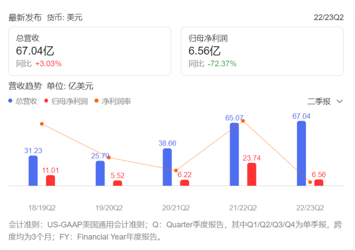 英伟达2022年Q2季度财报显示:英伟达二季度营收入为67亿美元,环比跌幅19%;净利润6.56亿美元,较去年同期的23.74亿美元暴跌72%;英伟达营收增速创下近年来新低,利润端各项数据全线下挫,游戏业务表现惨淡;今年以来英伟达股价累计已下跌超40%。