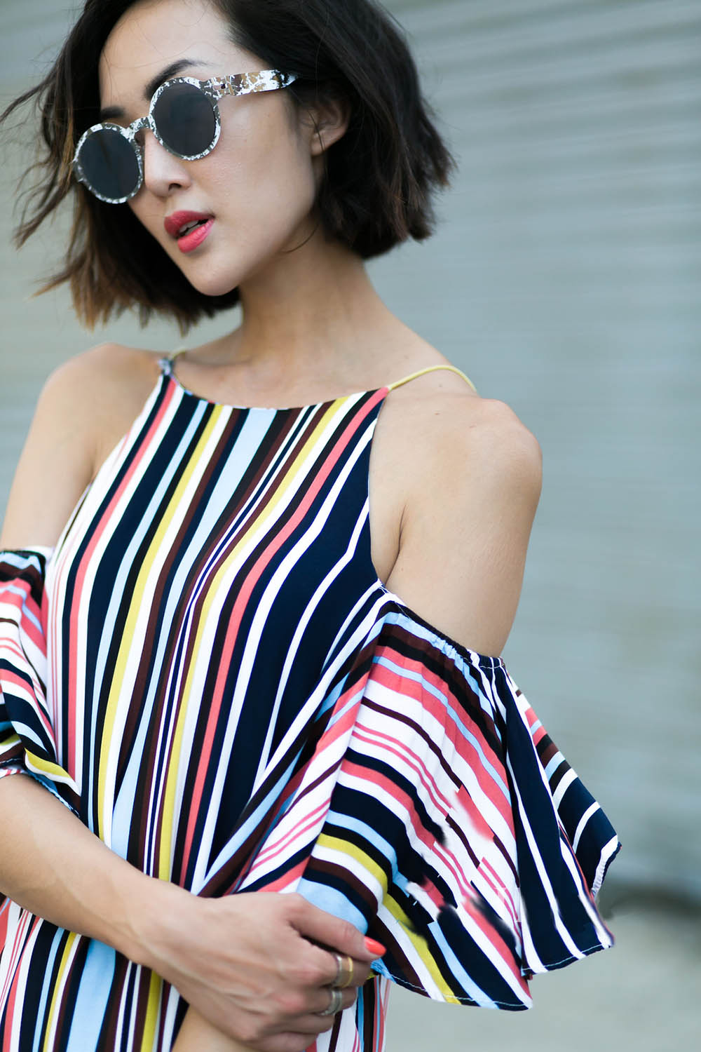 还有一个方法,是很多姑娘日常搭配的首选,就是条纹上衣+纯色裤子/裙子,这样既避免条纹太密集,又不用考虑太多关于如何去找一条条纹短裤搭配的问题,毕竟不是很多人都有色彩斑斓的条纹短裤。