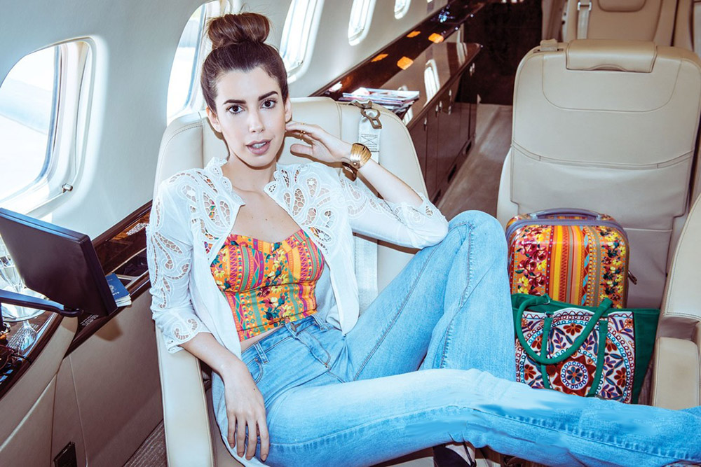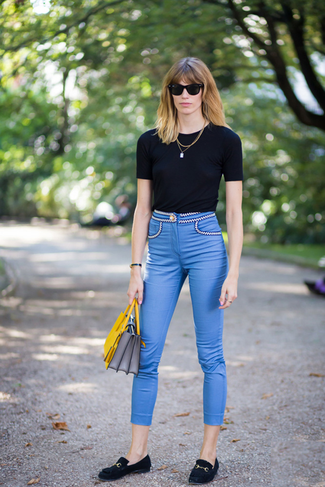 蓝色的衬衫开衫,搭配大耳环,如果觉得这样就够了,那还不够惹眼。让配饰来替造型加分,一个柠檬黄的小手提包会让你看起来精神很多。这也是穿衣的小tips,当全身都是比较平淡的衣着时,选择与衣服对立的色彩来碰撞出火花,例如蓝+黄,蓝+橙,红+白等。