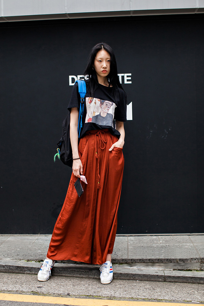 我们潜意识里的文艺书生范儿,大概就是“双肩包+球鞋,T恤+牛仔裤”的标配,如果还有一副金属框眼镜,那就更加标准。但这样的搭配大多数时候显得很大众,甚至觉得有点“呆”。而打破这种格调的方式,可以考虑加入一片大面积的色彩,例如一条橘红色的阔腿裙裤。大色块的黑色和橘色碰撞,带来复古文艺感。