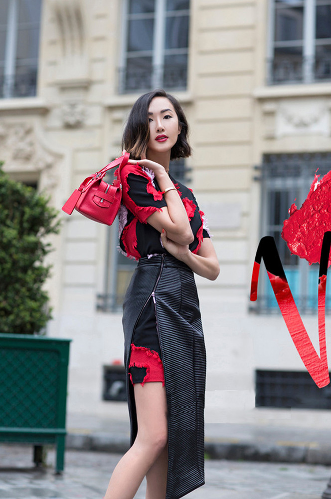连衣裙外包一条皮裙,黑+红的色块配合协调,如果你有一条印花的连衣裙,在颜色不是很花的情况下,可以找一件开叉裙配套穿,学习时尚博主的穿衣小技巧。