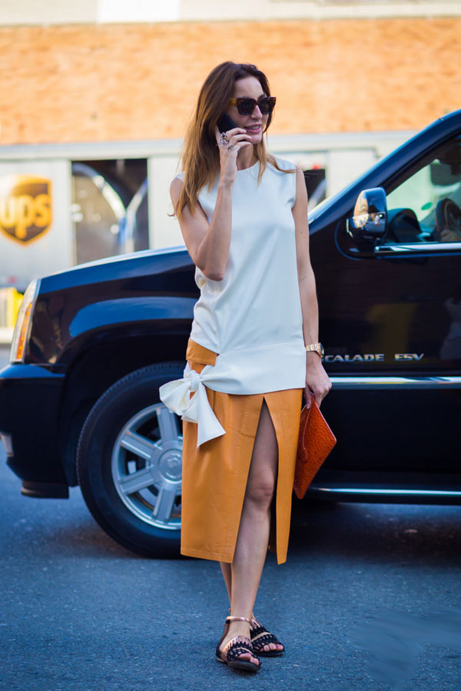 白橘色的低腰开叉铅笔裙,宽松的剪裁、降低的腰线,复刻了现代版的flapper。白+橘黄色感觉很舒服。