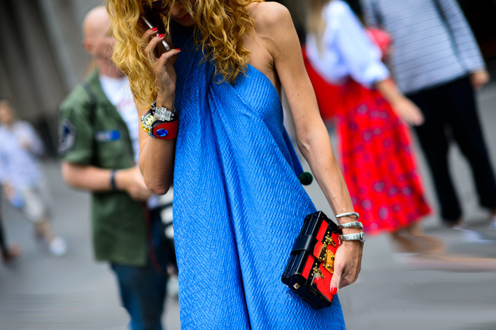 与上面的橙红色对比,下图的蓝紫色相对偏冷色调。时尚摩登,这样的搭配很容易产生距离感,白色的手拿包和黑色的鞋子是最安全百搭的中间色,可以放心使用。