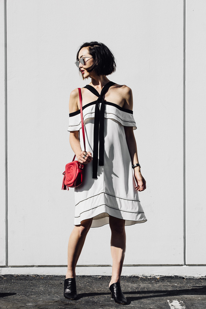 深色条纹与红色半裙的碰撞,浓郁的复古味道。衣橱里如果有长款的衬衫裙,用丝巾围绕腰间系成一条裙子,注意区分开色彩,撞色的调子最佳。红色玛丽珍很有复古的味道。