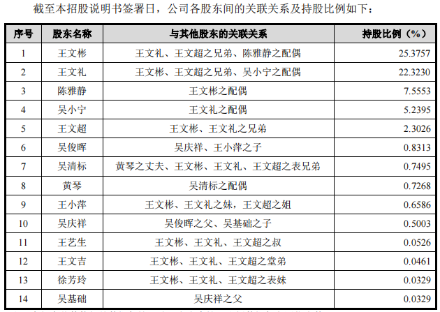 另外,核心技术人员、持股0.05%的王艺生,与王文彬、王文礼、王文超为叔侄关系;王文彬、王文礼、王文超之堂弟王文吉,持有发行前0.0461%的股权;王文彬、王文礼、王文超之表妹徐芳玲,持有发行前0.0329%的股权。