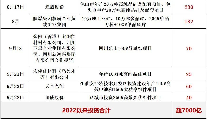 二、2022以来,光伏产能投资已超过7000亿,特别是龙头企业动辄百亿的投资(公告)频频出现,跨界者持续涌入,产能投资还在提速,阶段性绝对过剩风险加剧。