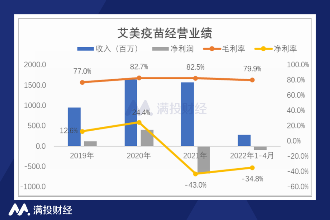 从经营情况看,2019年至2021年,公司实现总收入9.5亿元、16.4亿元和15.7亿元。公司的收入增长并不稳定,2020年同比大增72.1%,但2021年则同比下降了4.1%。公司解释,公司收入的下降主要是受新冠疫情的影响,2021年7月份以来,疫情的爆发影响了公司的疫苗销量,导致收入的下降。而进入2022年,疫情在国内复发,公司2022年1-4月的收入从2021年同期的4.6亿元同比下降40.8%至2.7亿元。