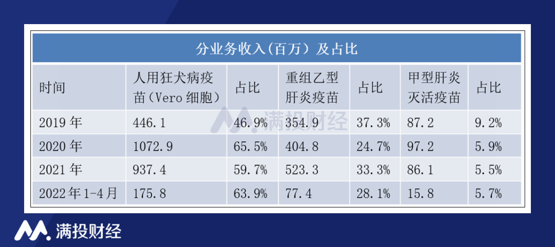 公司的收入绝大部分来自疫苗产品的销售,从产品矩阵来看,人用狂犬病疫苗以及乙型肝炎疫苗是公司较为依赖的两款产品,2019年至2021年以及2022年1-4月,两款疫苗产品产生的收入合计占公司总收入的84.2%、90.2%、93.0%及92.0%。
