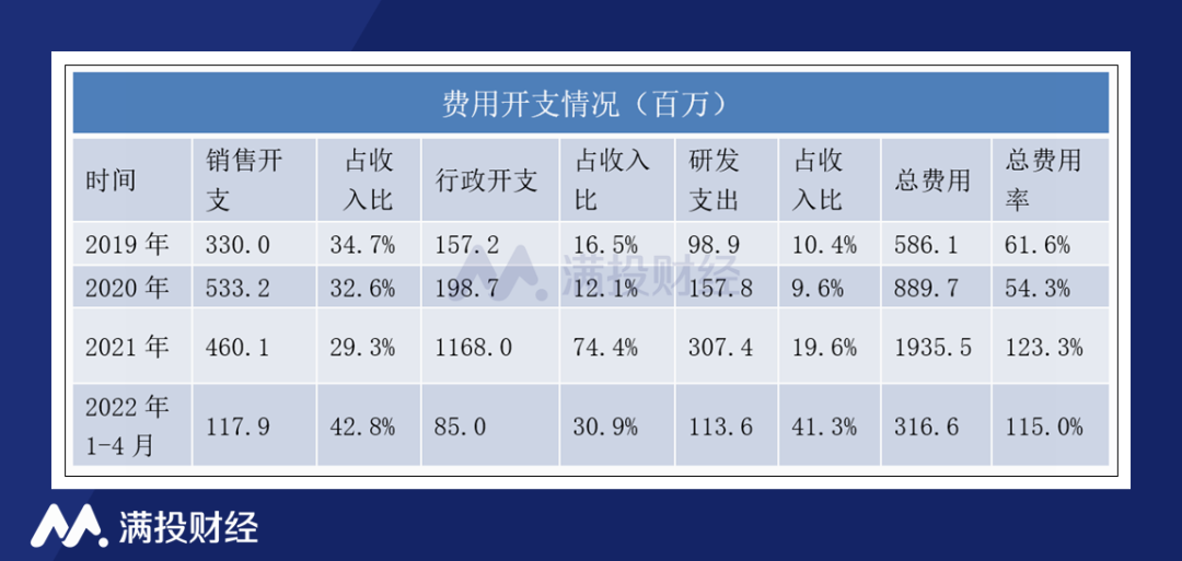 由于2021年以及2022年1-4月份收入的减少,但是公司的费用支出却大幅增长,总费用率达到123.3%和115%,公司的收入难以覆盖巨额的支出,导致同期产生净亏损。