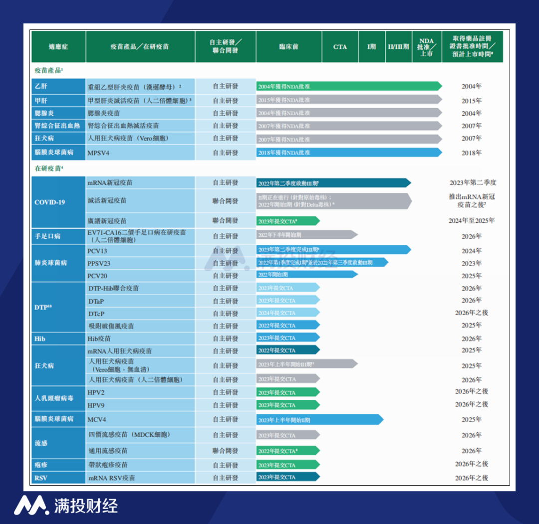 除了以上几款疫苗成功商业化,公司还有22款疫苗在研中,针对13个疾病。其中有5款在研疫苗处于临床阶段,公司计划在2023年末提交超过10项临床试验申请,同时预计将于2023年至2025年每年获得药品注册证书批准及╱或推出新疫苗产品,并于2026年及之后推出其他12款新产品,以保持多元化的产品组合。