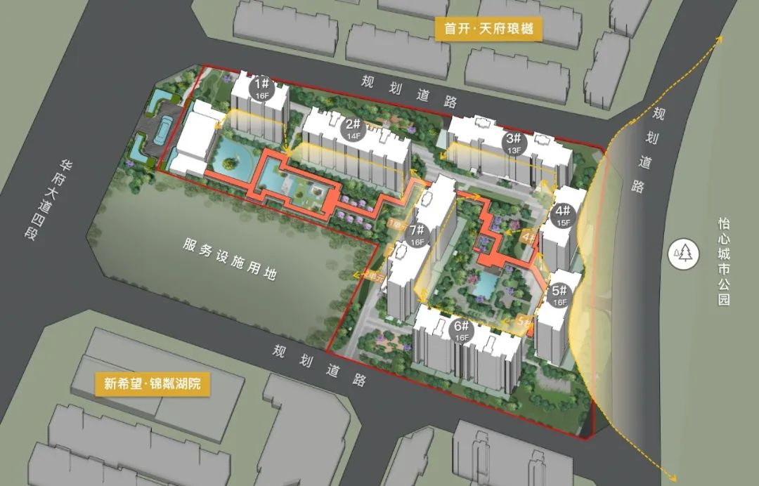 测算一下,中心景观轴+双中庭,合计约11亩,景观占比高达约73%。建面约143㎡户型,1、2栋享中轴景观,6栋享中庭景观。建面约175㎡户型,3、7栋享中庭景观。建面约196㎡户型,4、5栋享双面景观:主景观面看怡心城市公园,次景观面看中庭景观。