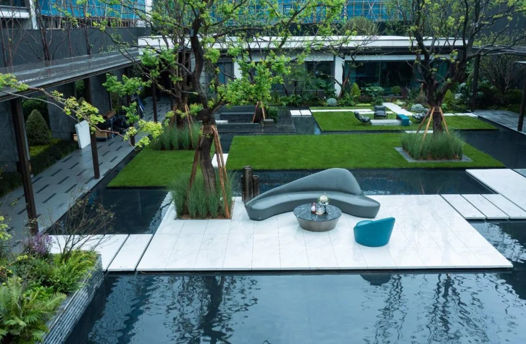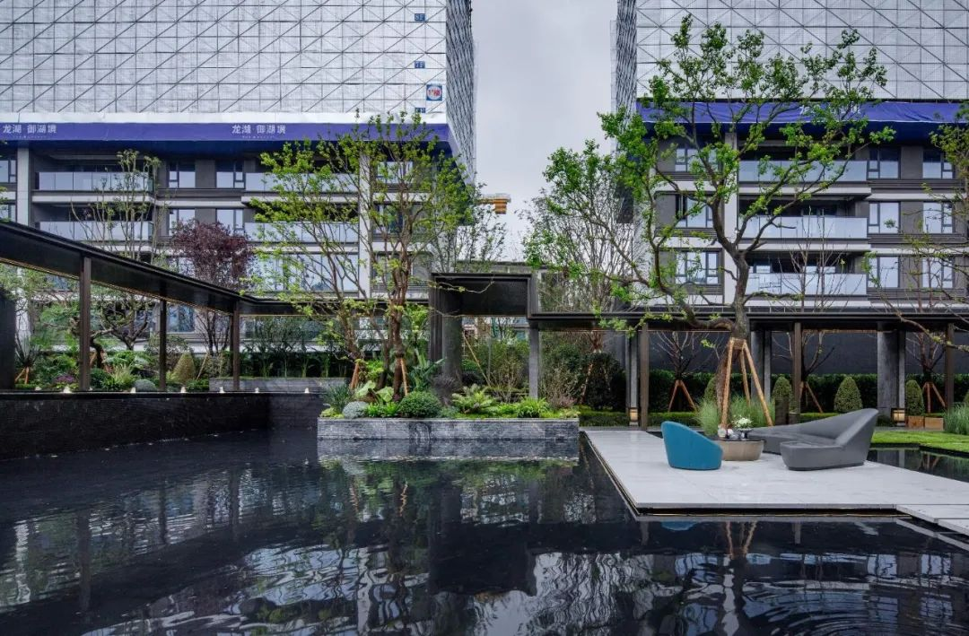 而更令人惊艳的,则是龙湖·御湖境在怡心湖的生态价值赋能之上,复刻了曼谷四季酒店“引水入园”的灵感,在项目内部呈现了约19000㎡的园林景观,让内外皆为“湖景”。