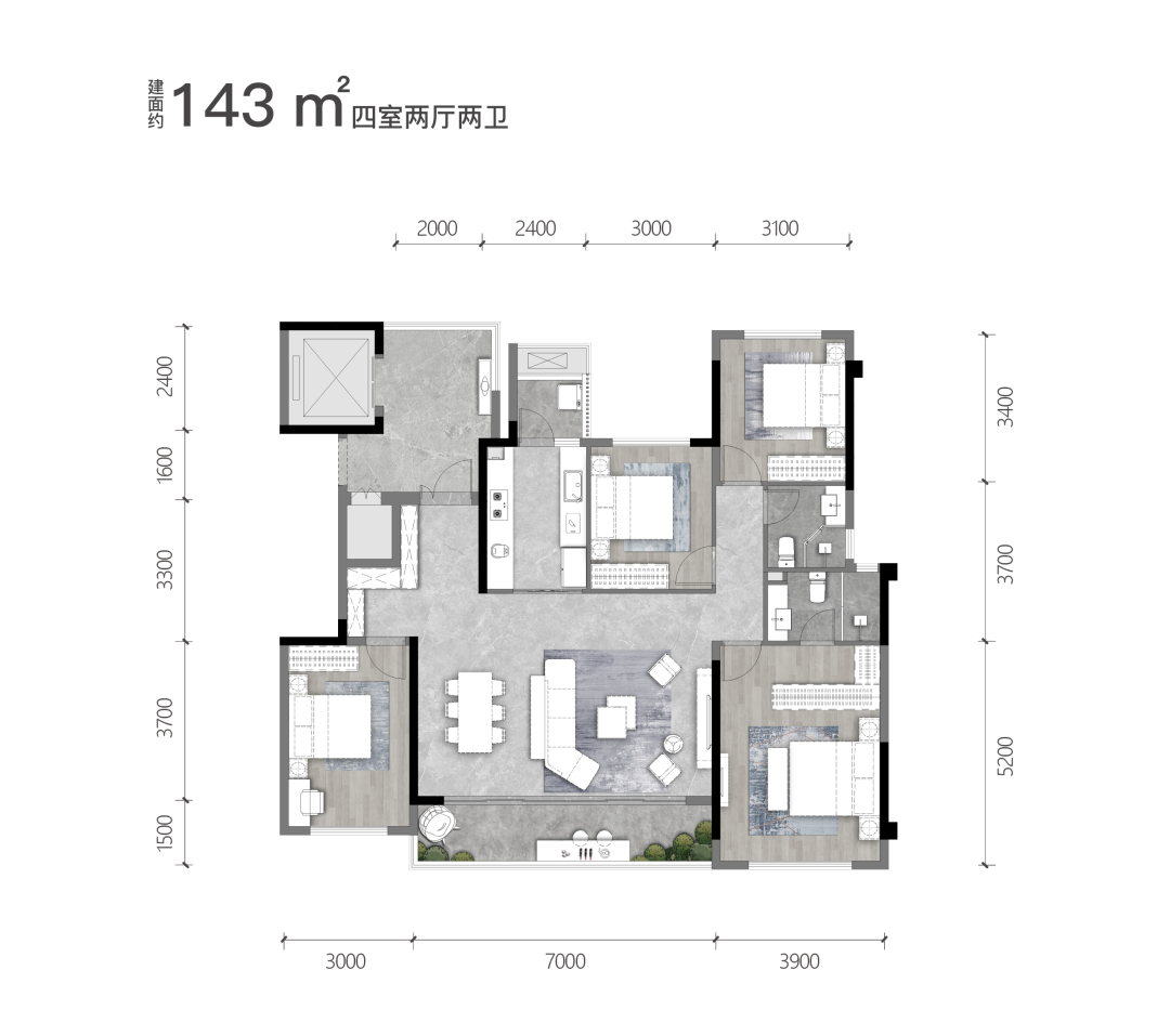 四房户型,实际使用面积约131㎡,加上全明独立私家电梯厅,使用面积约141㎡,几乎是0公摊户型。开敞景观阳台、独立生活阳台、次卧开间均不小于3米……关键还是清水交付,总价可控,下楼就是主会所和风雨连廊,享豪宅配置,可以说强到天边。