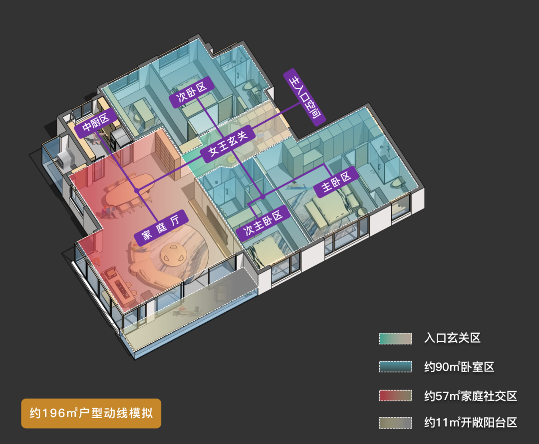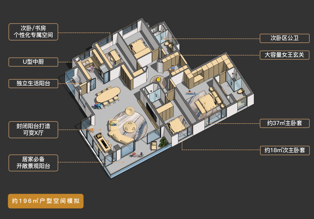 再者,它的公区空间更合理。“LDK厅+X可变空间+景观阳台”组成的公区空间使用面积约76㎡,尺度能与200㎡以上户型对线。约270°的观景阳台,可以正瞰怡心湖风景,视野无敌。基于图纸和模型分析,这版建面约196㎡端厅户型可以给到9分。