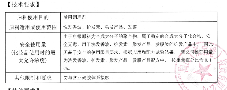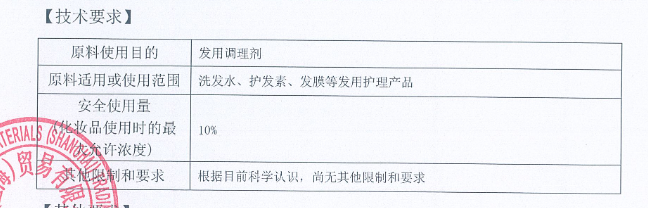 除了“双-二异丙醇胺-PG-丙基聚二甲基硅氧烷/双-异丁基PEG-14共聚物”原料使用目的为发用调理剂,适用于洗发香波、护发素、染发产品、发膜产品外,还有两家企业曾备案过发用原料。