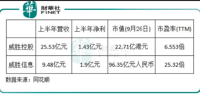 根据同花顺数据,截至9月26日收盘,威胜控股的市值为22.71亿港元,市盈率(TTM)仅为6.553倍;而威胜信息市值高达96.35亿港元,市盈率(TTM)为25.32倍。两者相差甚大。