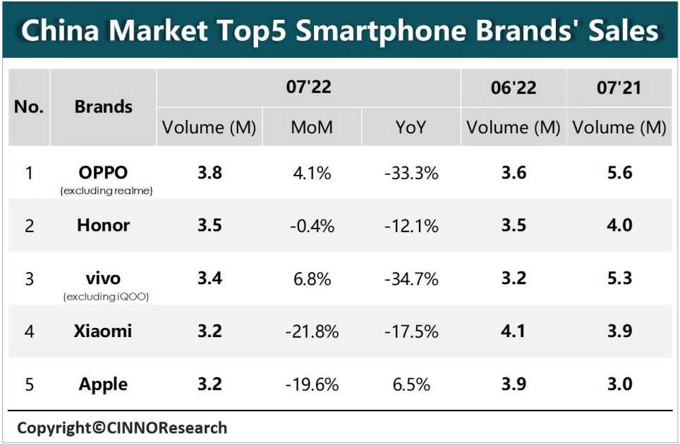 7月国内主流手机品牌销量同比均呈现负增长,来源:CINNO Research