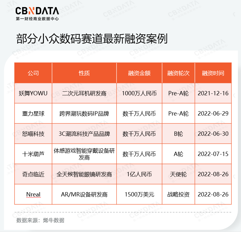 手机行业陷入的境况也是传统的“三大件”共同面临的问题(数码三大件指手机、平板、笔记本电脑)。根据CBNData《2022中国新消费品牌增长力白皮书》显示,近年来,中国3C数码市场的发展出现新变化。一方面,传统3C数码产品饱和度逐渐上升,个性化、高端化成为这个存量市场的竞争重点;另一方面,可穿戴智能设备、TWS耳机、智能家居等3C数码新兴产品市场需求逐渐释放。与此同时,致力于解决小而美需求的企业也持续吸金,热钱不断涌入,C站整理了部分小众数码赛道的最新融资案例: