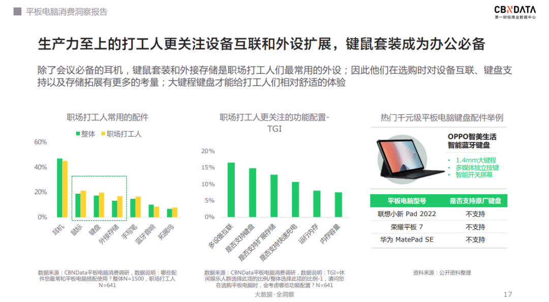 首先是以生产力工具为代表的数码产品正受到年轻人的喜爱。根据CBNData发布的《平板电脑消费洞察报告》显示,生产力至上的打工人更关注设备互联和外设扩展,键鼠套装成为办公必备。