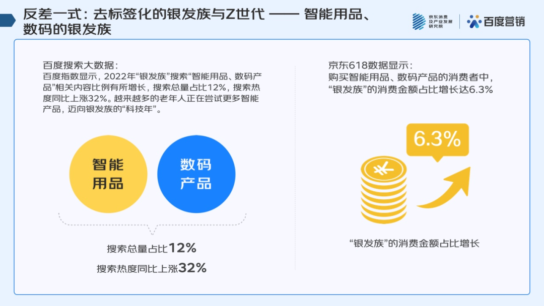 同时,数码产品也不再是年轻人的专属,随着数字经济的发展,银发族也开始接受并使用智能化电子产品。百度联合京东发布的《“6·18”消费趋势洞察报告》显示,2022年以来,“银发族”搜索“智能用品、数码产品”相关内容的搜索占比提升至12%,搜索热度同比上涨32%。今年“6·18”购买智能用品、数码产品的消费者中,“银发族”的消费金额占比增长达6.3%。