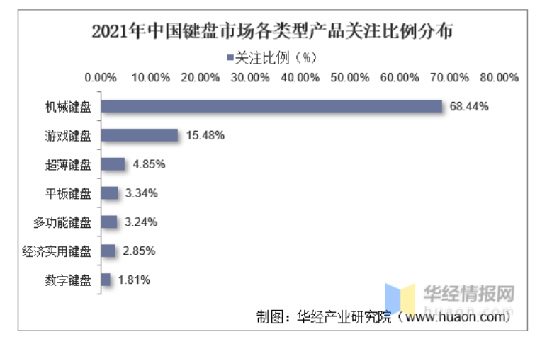 以机械键盘为例,近年来随着电竞行业的发展,以及办公人士对个性化和效率的追求,反应灵敏、具有节奏感的机械键盘走进大众视野。根据华经产业研究院数据显示,从键盘各类型产品关注度情况看,机械键盘遥遥领先于其他类型产品,2021年的关注比例达到68.44%。