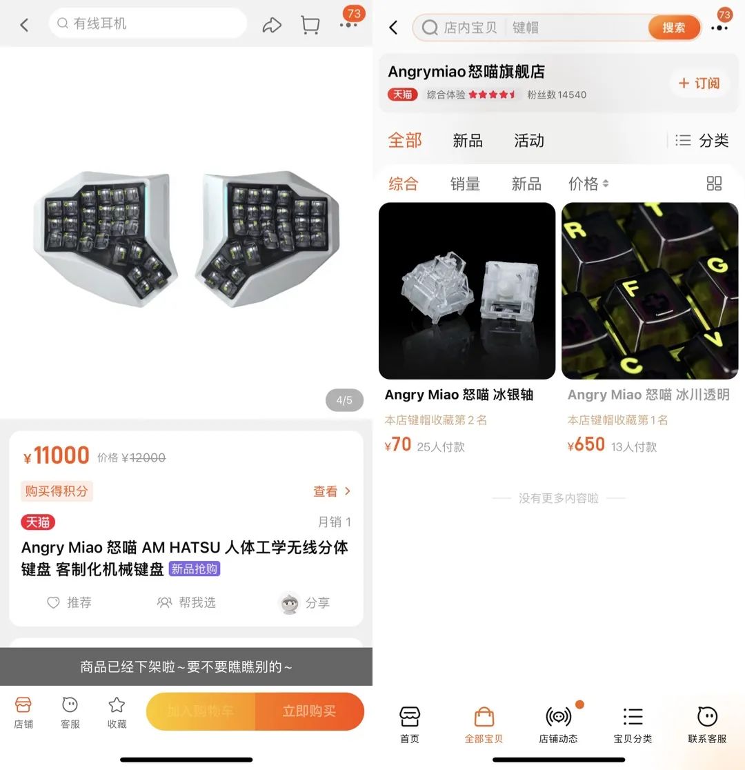 左为怒喵人体工学键盘AM HATSU,右为店铺详情,来源:怒喵天猫旗舰店