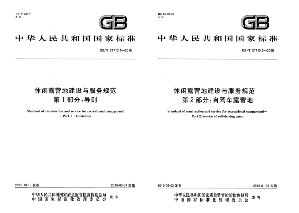 2015年,全国休闲标准化技术委员会组织发布了《休闲露营地建设与服务规范》(简称《规范》)的第一批四个国家露营地系列标准,对休闲露营地进行了不同标准的分类,从建设角度分为了自驾车营地、帐篷露营地和青少年营地三个大类,并分别提出建设意见。