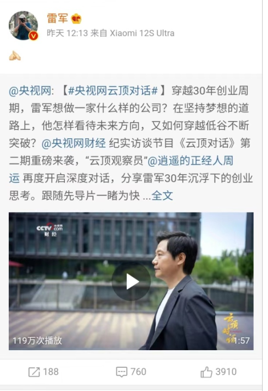 近日,雷军在其个人微博转发了自己接受央视纪实访谈节目《云顶对话》的视频,分享了自己过去的经历。