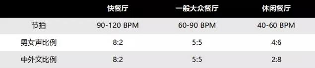 在李娜看来,现成歌曲一般来说会根据餐厅的类型按照音乐节拍的缓急、男女歌手比例以及中外文比例来划分。节拍的单位是BPM——beats per minute,即一分钟节拍数。这是相对容易统一风格和听觉体验的办法。