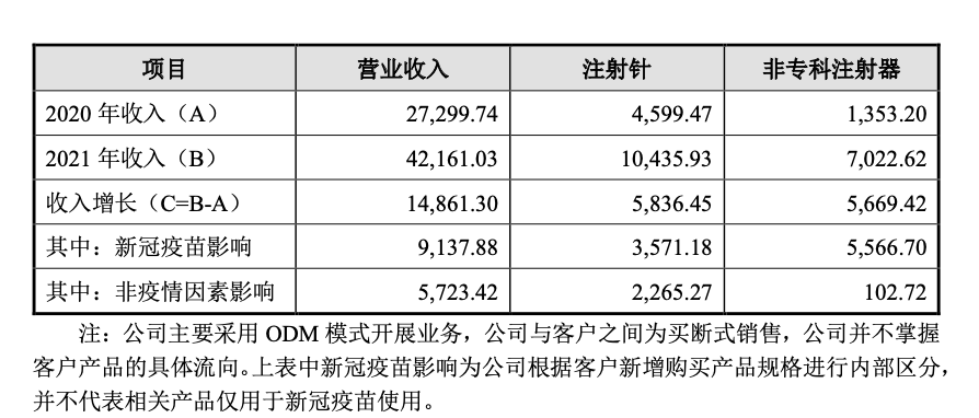 贝普医疗在招股书中提到,2020年第一季度受新冠疫情的影响,公司开工率不足,客观上拉低了全年营业收入的基数。注射针及非专科注射器产品总体上维持一个比较好的增长态 势,2021年叠加新冠疫苗接种的外部因素,市场对注射针及非专科注射器产品的需求旺盛,上述产品营业收入合计较上年增加1.15亿元,增长193.29%,因此进一步提升了公司 2021年的营业收入水平。